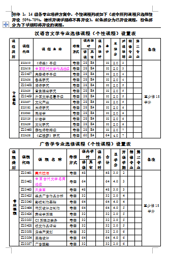 另外,“个性课程”修满15学分以上即可满足毕业所需选修课学分要求。请同学们参照附件中《人文传播学院2014级各专业课程体系学分分配表》做好选课计划,合理选择各学期课程。