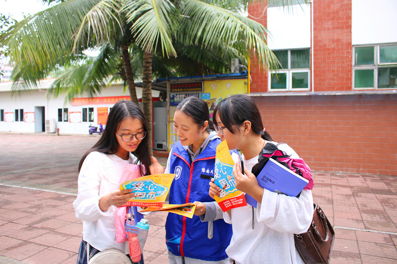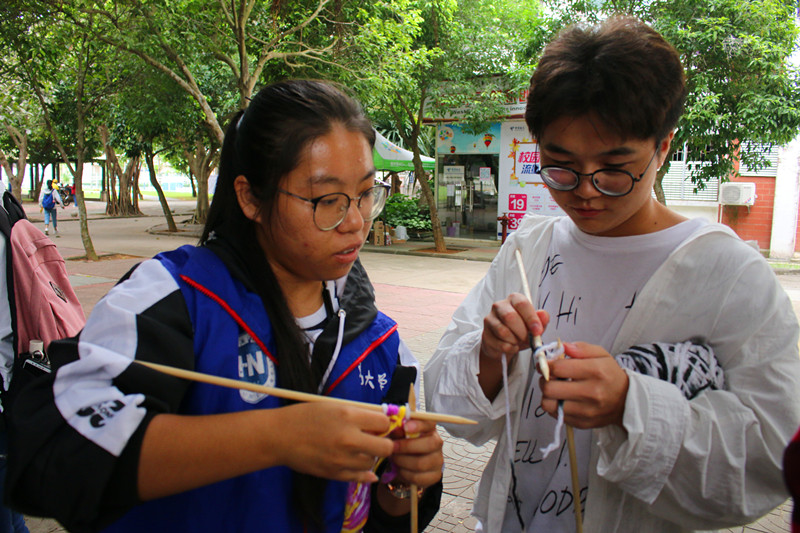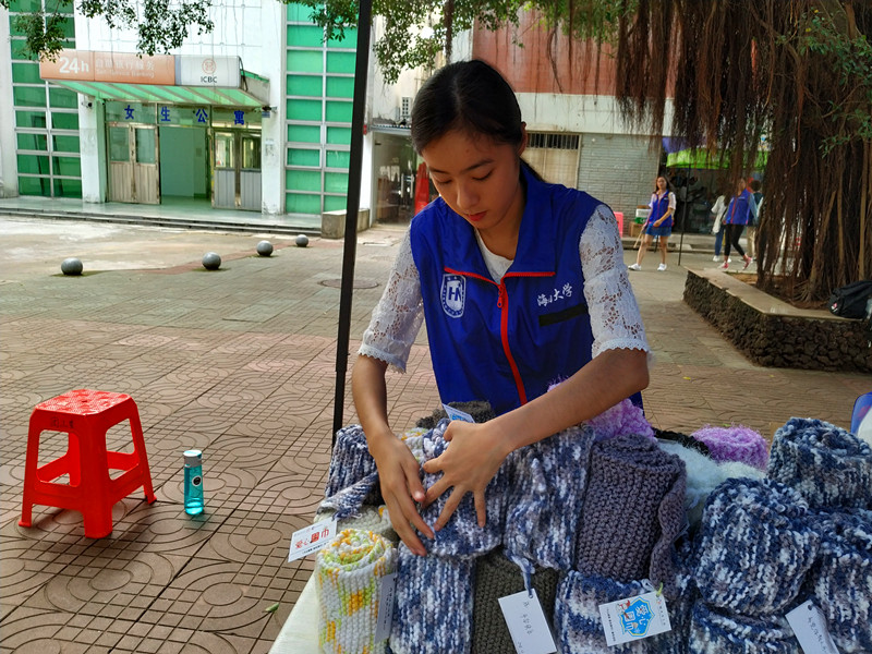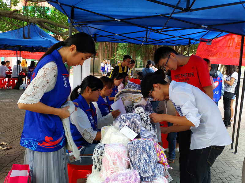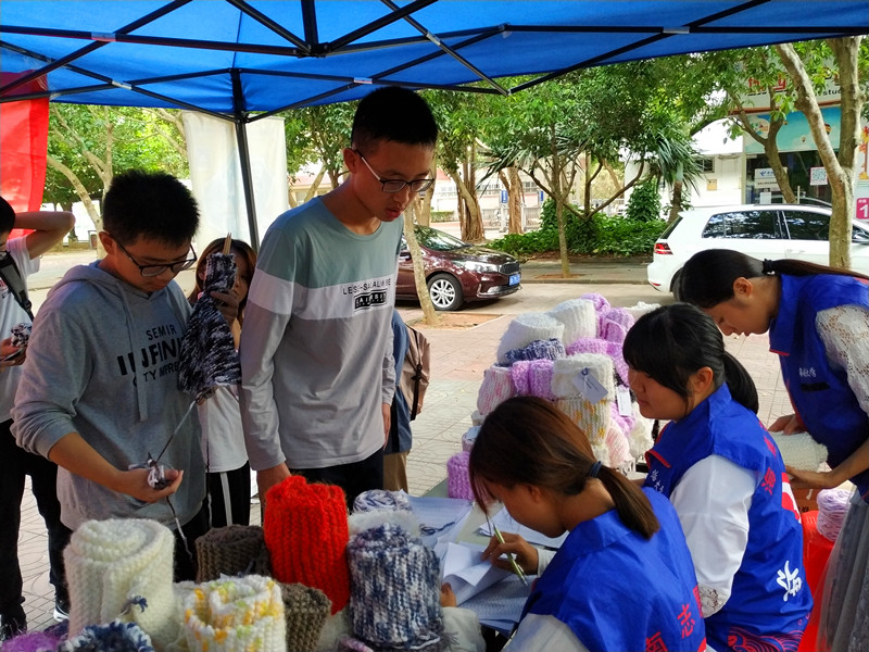 海甸校区椰林小道开展,于11月22日、24日在城西校区大榕树下开展。活动过程中,海大材化青协和海大人文青协的志愿者将毛线与织针分发给前来报名的同学,并协助进行报名信息登记,志愿者耐心地进行编织教学并负责解惑答疑,由参与活动的同学们编织成围巾后进行统一回收,捐赠给西部贫困山区的儿童们,在冬日里送上来自台湾uu