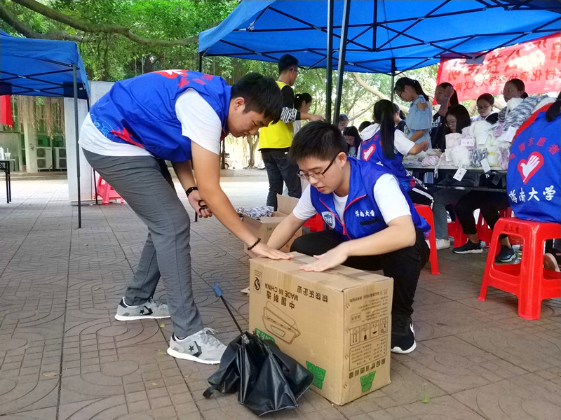 城西校区大榕树下,由人文传播学院青年志愿者协会和材料与化工学院青年志愿者协会联合举办的“爱心围巾”公益活动正在进行围巾回收工作,来自两个学院的13名志愿者各负其责,活动顺利进行。