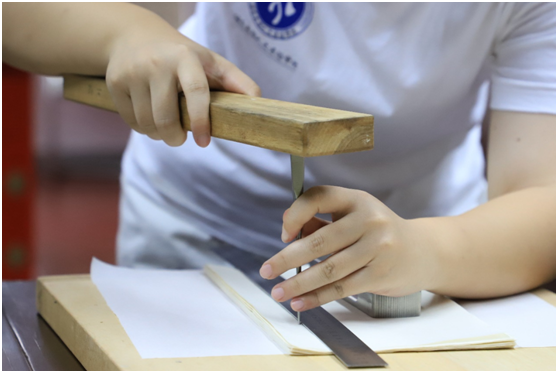 线装又称古线装,是书籍装订的一种技术,其出现表明了我国的装订技术进入一个新的时代。线装书步骤繁琐且精细,需要装订者具有耐心和细心。黄老师带领队员们首先进行第一步折纸,将裁好的纸张一张纸对折,再用石板压平,确保书页和对折处平整;次之是将纸张墩齐,以保证书翻页一侧的的每一张纸都是在同一水平线上;其后黄老师手把手指导实践队员制作纸捻固定纸张,把书芯移至木板上,用铁块压住固定,找到书宽13厘米横长处的三分点,将铁锥垂直“点”在其上,进行打孔,再把先前做好的纸捻顺洞孔穿下,将多余的部分用浆糊粘在纸张上;最后一个步骤是装订成书,线装书书皮的粘贴、书线的穿绕与收尾,书皮的粘贴很简单,只需将与书芯大小相同的牛皮纸张粘贴在封面上即可。在黄老师的演示与教学中,实践队员按步骤一步步地进行着,持着耐心与细心,静心完成线装书的装订。