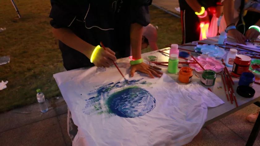 当天下午,工作人员和志愿者提前到达了活动场地开始进行活动场地布置、物资整理等准备工作,组织陆续到场的夜跑选手使用各色荧光笔进行文化衫DIY绘制,并向他们配发荧光手环、指扣灯、夜光头饰等必要物品。准备工作进行得有条不紊。